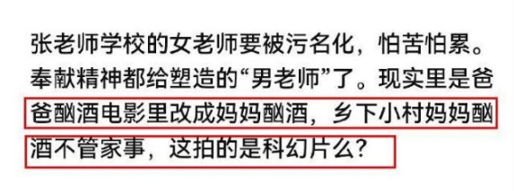 因为,有网友发现,影片被魔改了,甚至指出影片有污名化女性之嫌,比如:故事原型学生是父亲酗酒家暴,但在片中酗酒家暴的人从父亲变成了母亲,还有大山里的女学生不爱学习,喜欢逃学逛街。