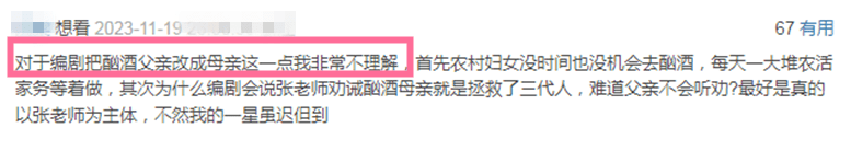 这些情节让不少网友无法接受,称现实里是父亲酗酒,怎么电影里就成了母亲酗酒还家暴,纷纷质问编剧为何会如此魔改,出现这样脱离现实的改编?