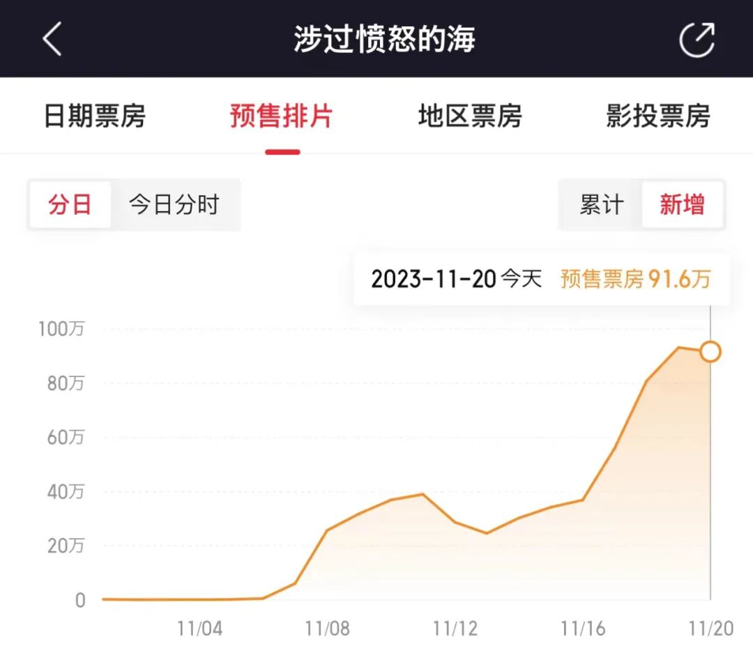 在上周首映礼后,《怒海》超出预期的完成度引得首批行业观众的争相盛赞。因此尽管《怒海》要在本周四才能揭晓大众口碑,但有了班底、话题和业内口碑作保,丝毫未影响观众热情,预售日增处于稳步上涨状态。