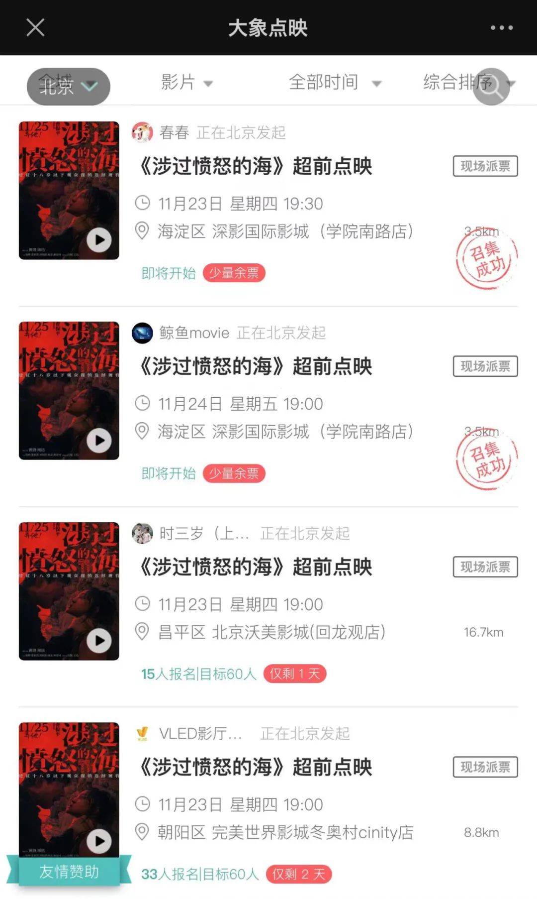 乃至到了即将启动的点映、路演阶段,《怒海》也明显着重控制了规模人群。此次该片选择的大象点映平台独家点映的策略在行业内都不算多见。由KOL申请开团,在11月23日和24日于16个城市限量开场,只有在参与人数成团后才能够顺利点映。影迷爱用平台 核心受众群体,这样的精准操作有望最大程度保障汇集目标受众和正向口碑反馈。
