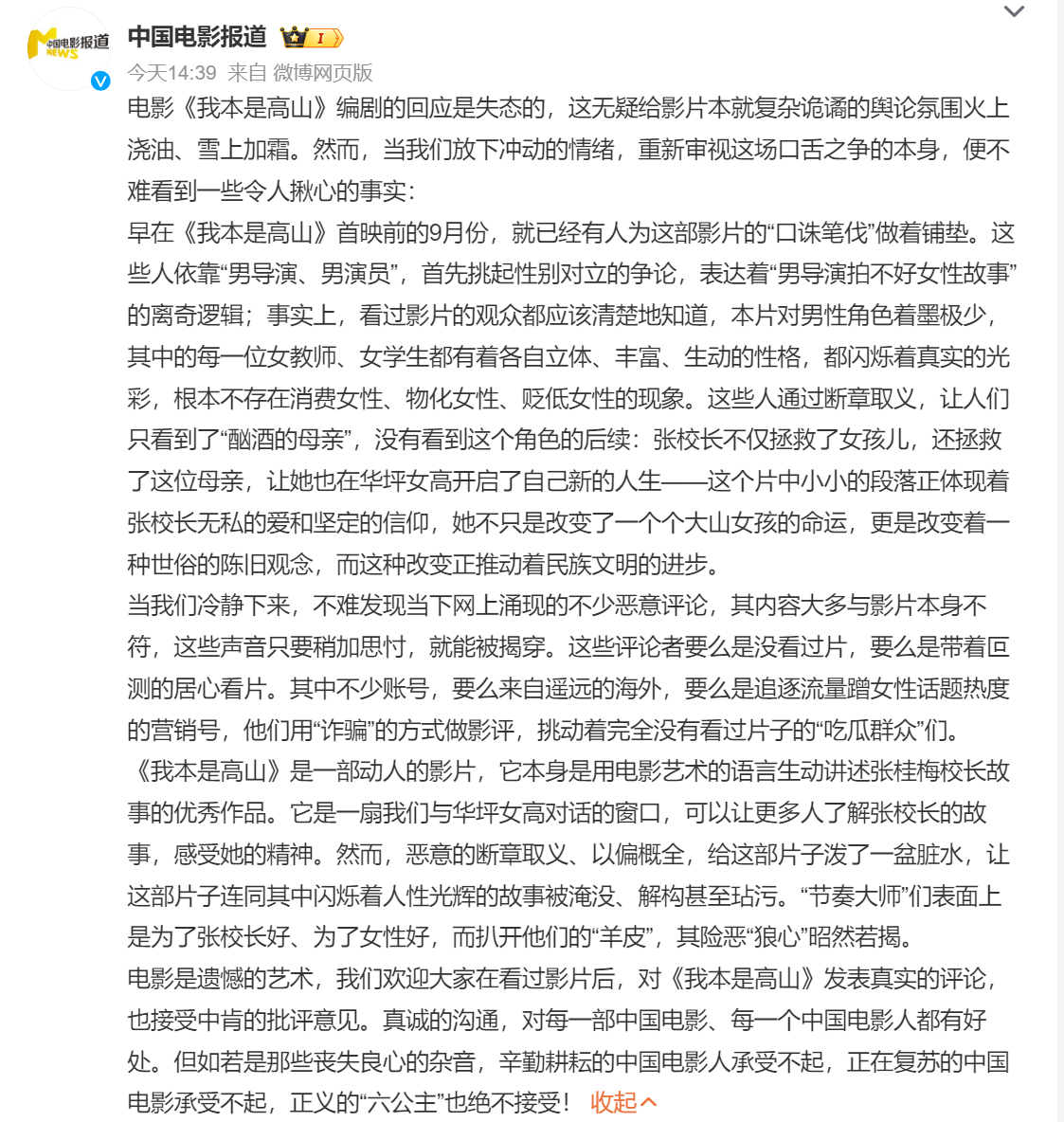 其实在这样的舆情下,硬刚网友是不理智的,用这样的语气、这样的措辞更是错上加错。很快,“六公主回应我本是高山争议”冲上热搜。中国电影报道发长文声援电影,但长文的第一句就是批评编剧“电影《我本是高山》编剧的回应是失态的,这无疑给影片本就复杂诡谲的舆论氛围火上浇油、雪上加霜。”