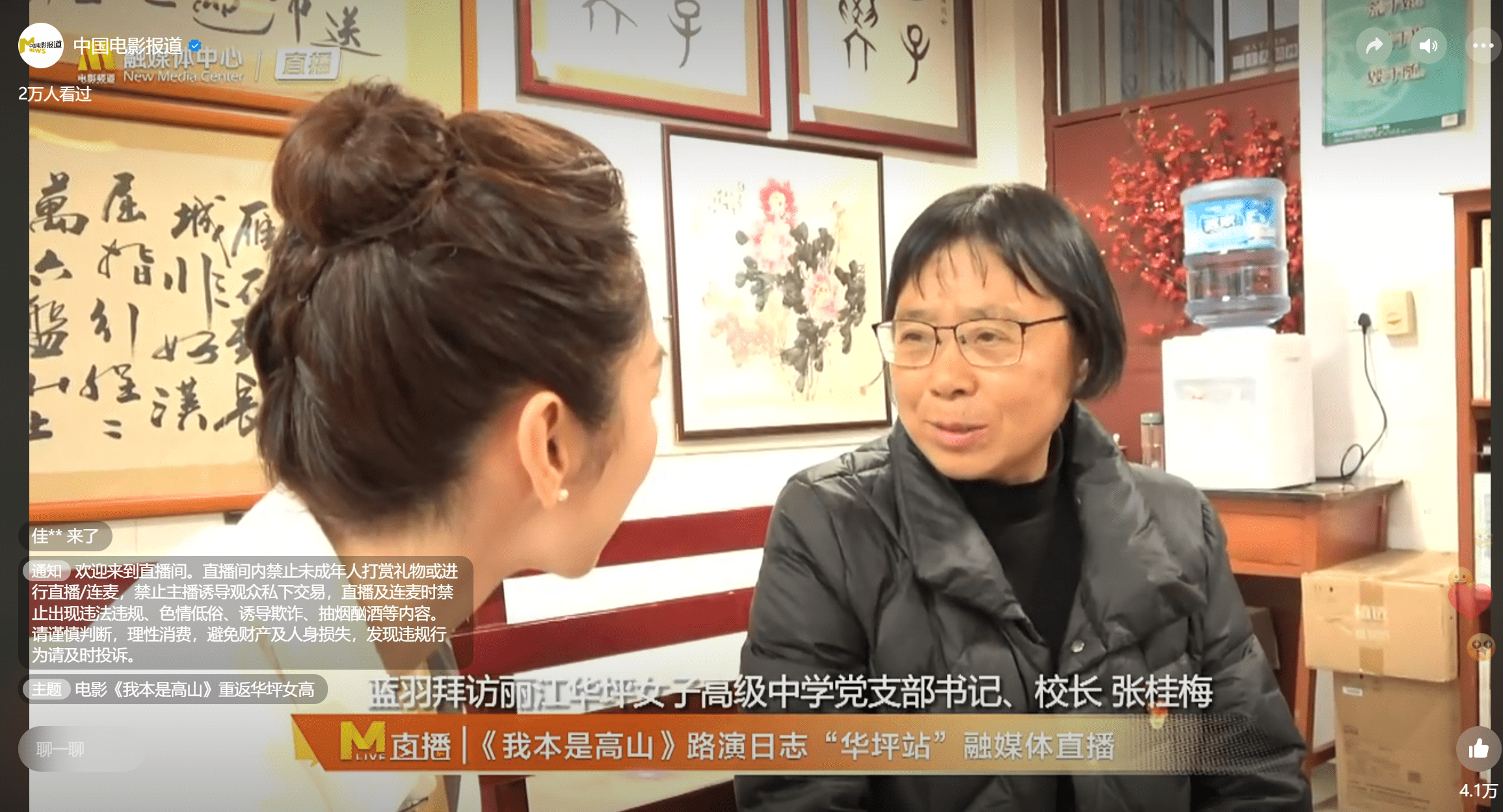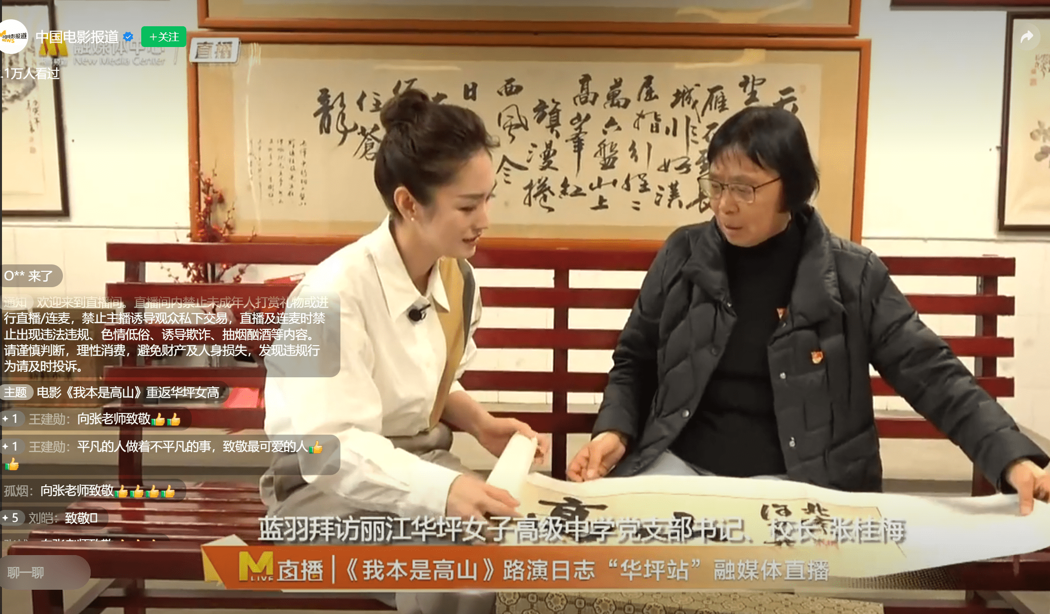 直播中,主持人蓝羽和张桂梅老师对谈了很长时间,张桂梅老师非常健谈,谈到了她和学生们的相处,带领乡镇干部为修路的事情奔走,还回忆了自己当年在一部电影里客串过一个角色,遗憾的是那部电影最终没能上映。对谈的最后,蓝羽也对张桂梅老师出现在电影路演上表示期待。