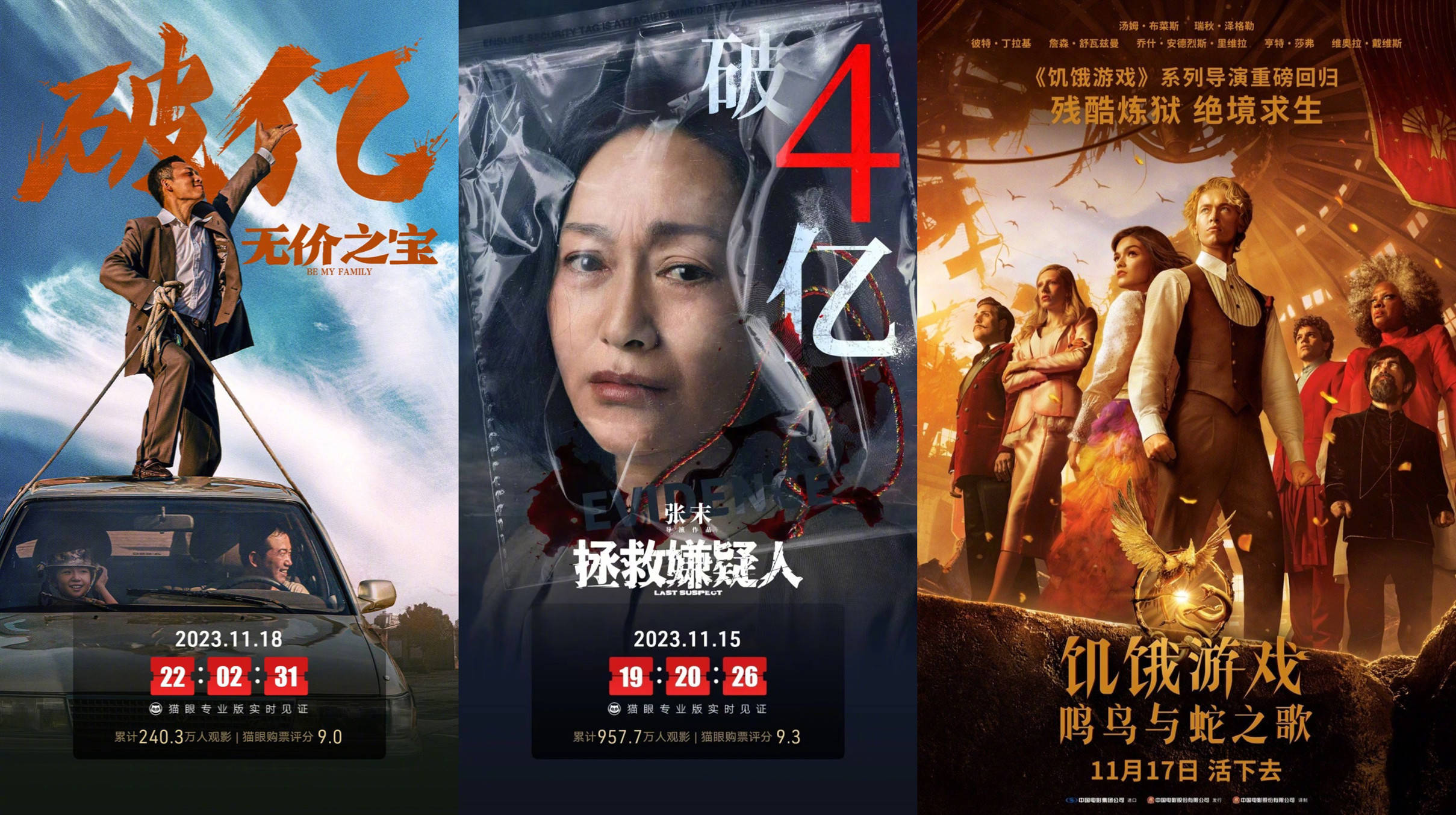 悬疑犯罪电影《拯救嫌疑人》第三周收1.17亿夺冠,上映19天累计4.89亿;张译、潘斌龙主演温情喜剧电影《无价之宝》次周收6187.25万居亚,上映10天累计1.11亿;中美同步上映的“饥饿游戏”系列前传电影《饥饿游戏:鸣鸟与蛇之歌》票房不济,首周末三天仅进账3322.86万排名第三。