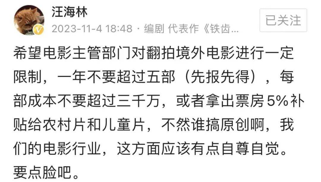 著名编剧汪海林发文,呼吁限制翻拍境外电影的数量和成本。