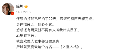 11月7日,陈坤在个人社交平台发文,称他已连续拍摄了22天打戏,虽然身体疲乏,但仍舍不得离开剧组和角色。