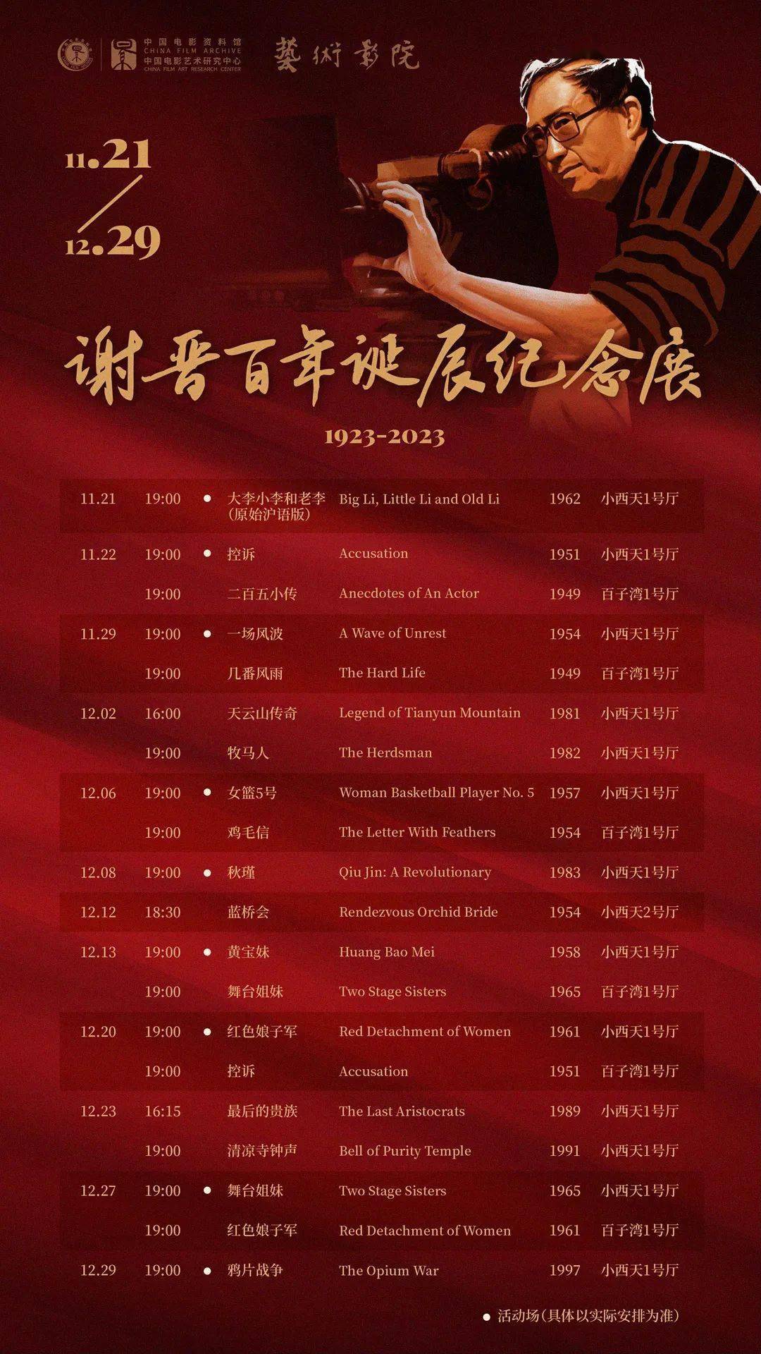 2023年,正值谢晋诞辰100周年,为纪念与缅怀这位成就卓越、影响深远的电影大师,弘扬优秀的中国电影文化,中国电影资料馆特别策划“谢晋百年诞辰纪念展”, 将在11月21日至12月29日间,于艺术影院展映17部谢晋创作的电影。