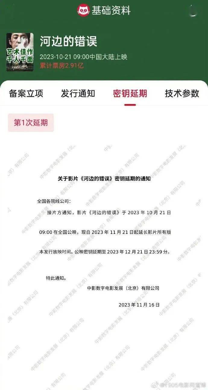 11月16日,电影《河边的错误》宣布密钥延期,将延长上映至12月21日。影片由魏书钧执导,朱一龙领衔主演,曾美慧孜、侯天来、佟林楷、康春雷、黄俊主演,改编自余华同名小说,当前累计总票房2.91亿。