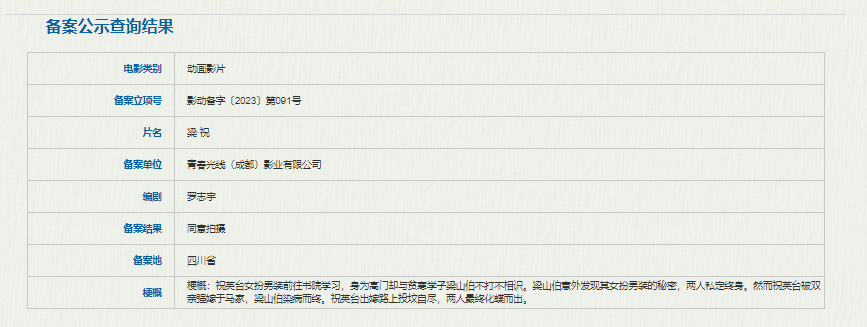 该片光线传媒动画电影新作品,取材自中国民间四大爱情故事之一《梁山伯与祝英台》。影片讲述了梁山伯、祝英台这对古代青年男女为爱殉情,两人最终化蝶而出的悲惨故事。