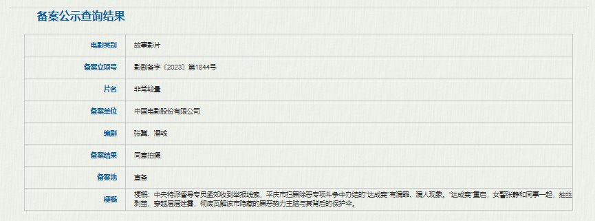 该片是一个近年比较热门关于扫黑除恶的电影创作题材。该片故事梗概:中央特派督导专员孟郊收到举报线索,平庆市扫黑除恶专项斗争中办结的“达成案”有漏罪、漏人现象,“达成案”重启,女警张静和同事一起,抽丝剥茧,穿越层层迷雾,彻底瓦解该市隐藏的黑恶势力主脑与其背后的保护伞。