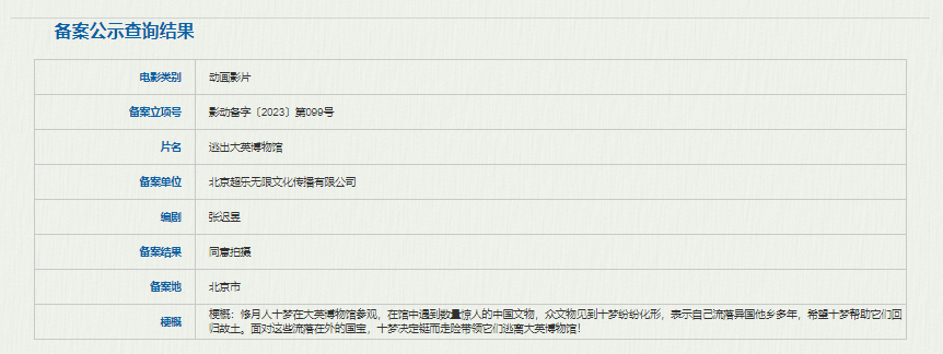 影片故事梗概:修月人十梦在大英博物馆参观,在馆中遇到数量惊人的中国文物,众文物见到十梦纷纷化形,表示自己流落异国他乡多年,希望十梦帮助它们回归故土,面对这些流落在外的国宝,十梦决定铤而走险带领它们逃离大英博物馆!