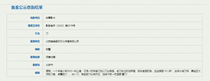 吴京担任监事的北京登峰国际文化传播有限公司备案的《刀》立项,编剧为贺馨。影片故事梗概:一个杀猪少年为讨一句公道,仅凭一把杀猪刀在以刀论英雄、名刀林立的世界里,激起百刀叱咤风云,但终不敌一把温柔“簪刀”。