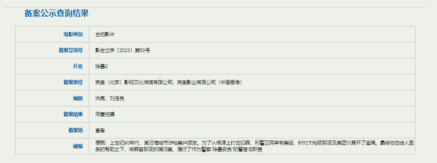 该片由《除暴1》原班人马打造,刘浩良担任编剧,王千源、吴彦祖主演。2020年11月,《除暴1》中国内地上映,并取得了5.38亿元的票房成绩。