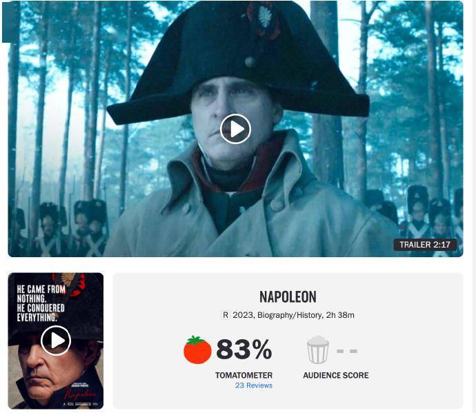 巴黎首映后,媒体评分也随之公布。烂番茄23个媒体评价,暂时83%新鲜度,获得7.7分。从评论来看,视觉、精心设计的战争场面,华金·菲尼克斯的表演仍是本片的亮点。同时,影片还充满着对拿破仑这个角色的讽刺,也有评论说,影片将拿破仑同时描述成强大的征服者及一个小丑,并让这两种形象互相呼应,以达到讽刺感。