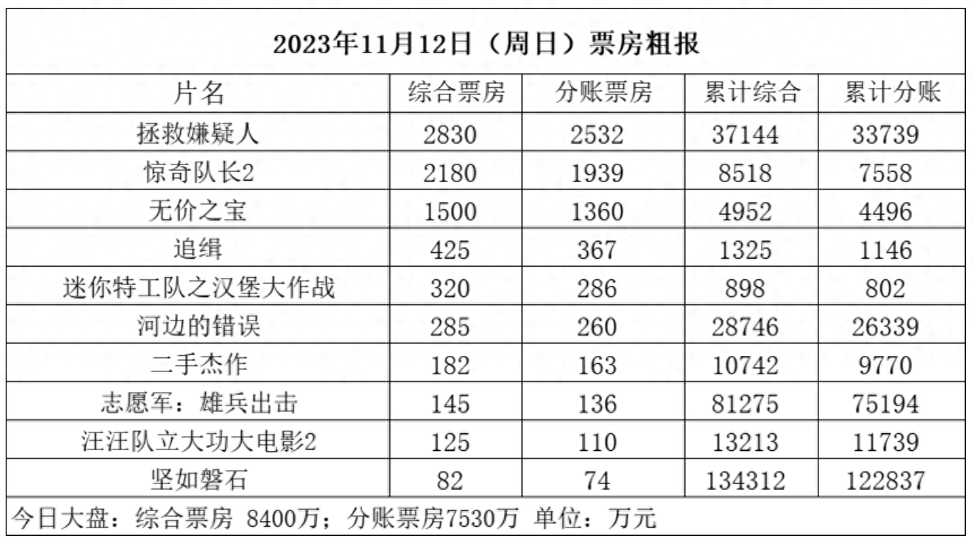 11月12日(周日),全国共排映40.1万场,观影人次约213.4万,根据初步统计产出票房8400万。