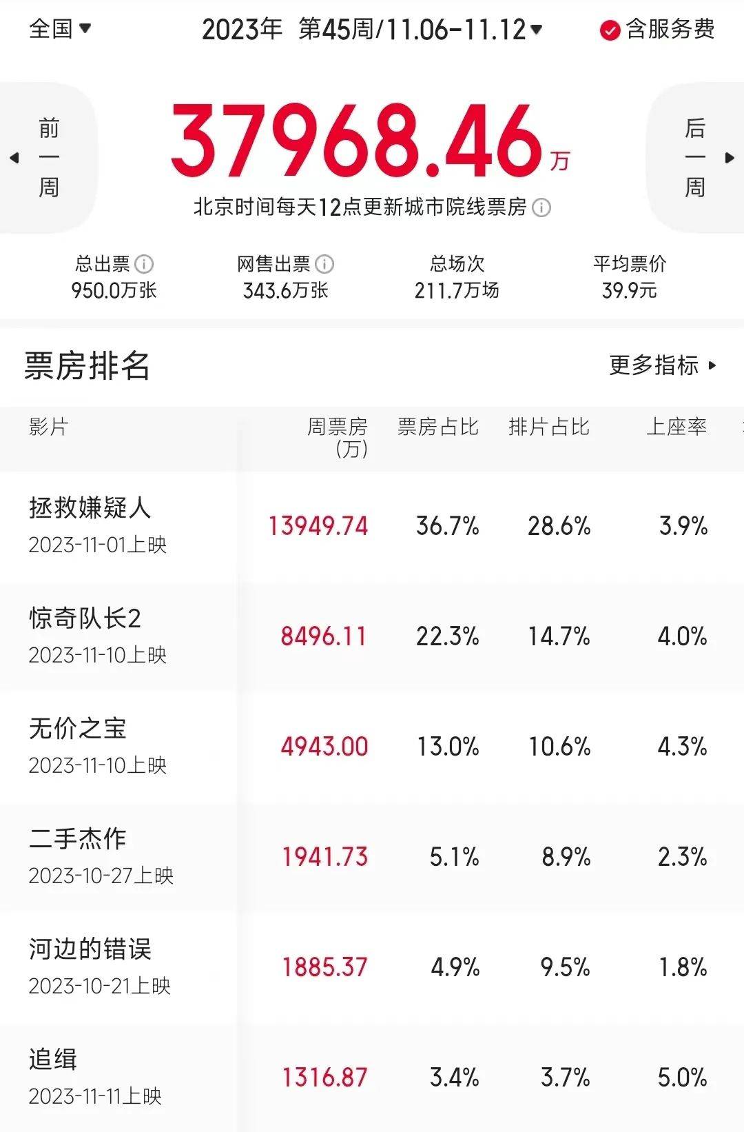 上周的影市不足以让人欣喜,中外三部新片票房均不及预期,导致大盘连续第五周下跌。据猫眼数据,11.06-11.12一周内地票房报收3.79亿,较前一周的4.04亿下跌6.2%。