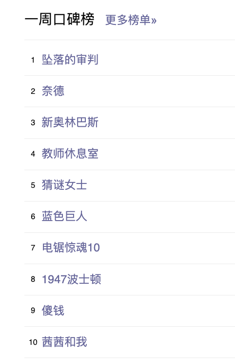 最后,还是例行附上一周豆瓣口碑榜的完整榜单: