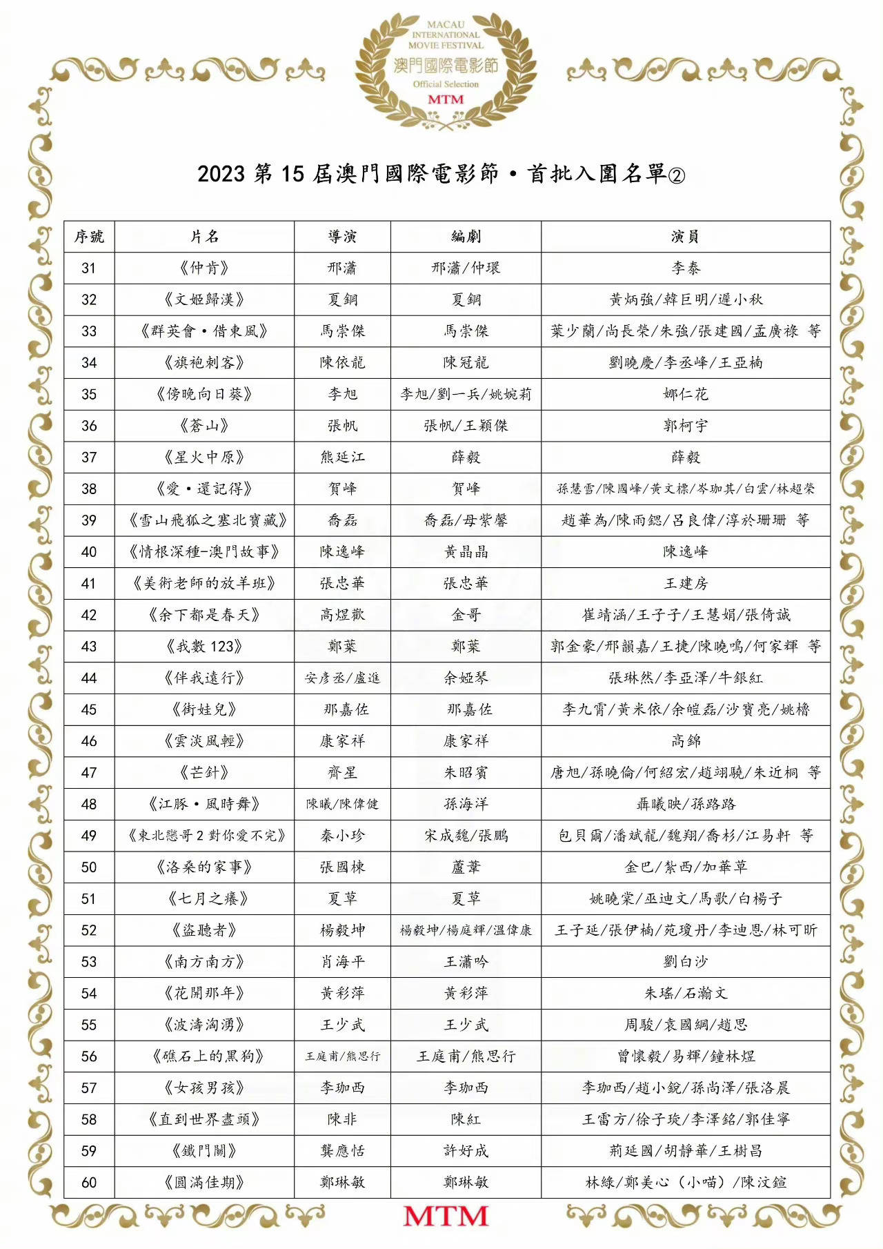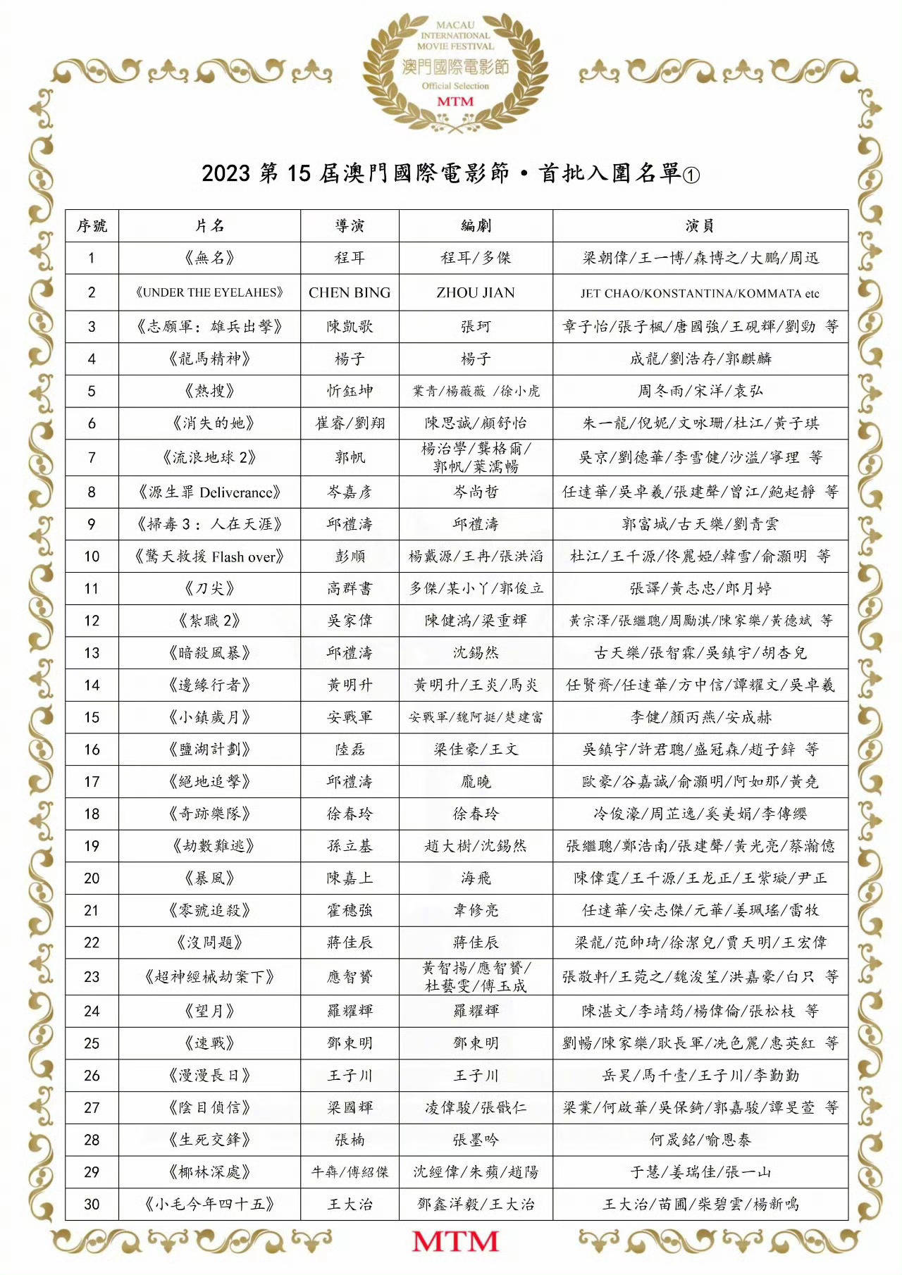 原标题:2023第15届澳门电影节公布首批入围名单 《消失的她》《无名》等60部影片入围