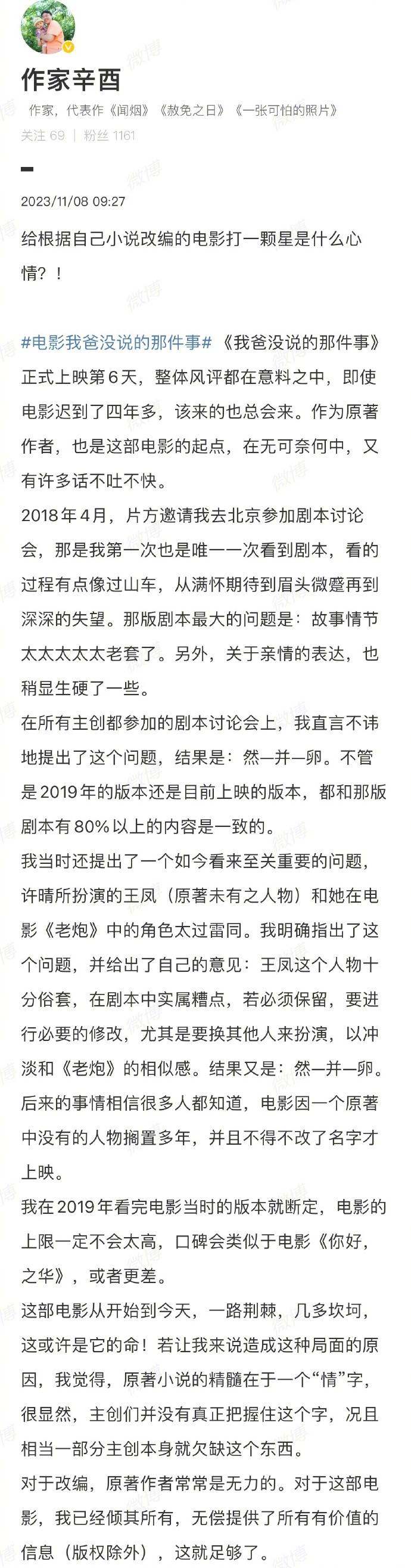 辛酉从2018年参加剧本讨论会开始讲起,称对剧本提出的问题和修改意见没有得到认可和回应,并在2019年看完当时剪辑的版本就断定票房上限不会太高,最后还说“对于改编,原著作者常常是无力的。对于这部电影,我已经倾其所有,无偿提供了所有有价值的信息(版权除外),这就足够了。”