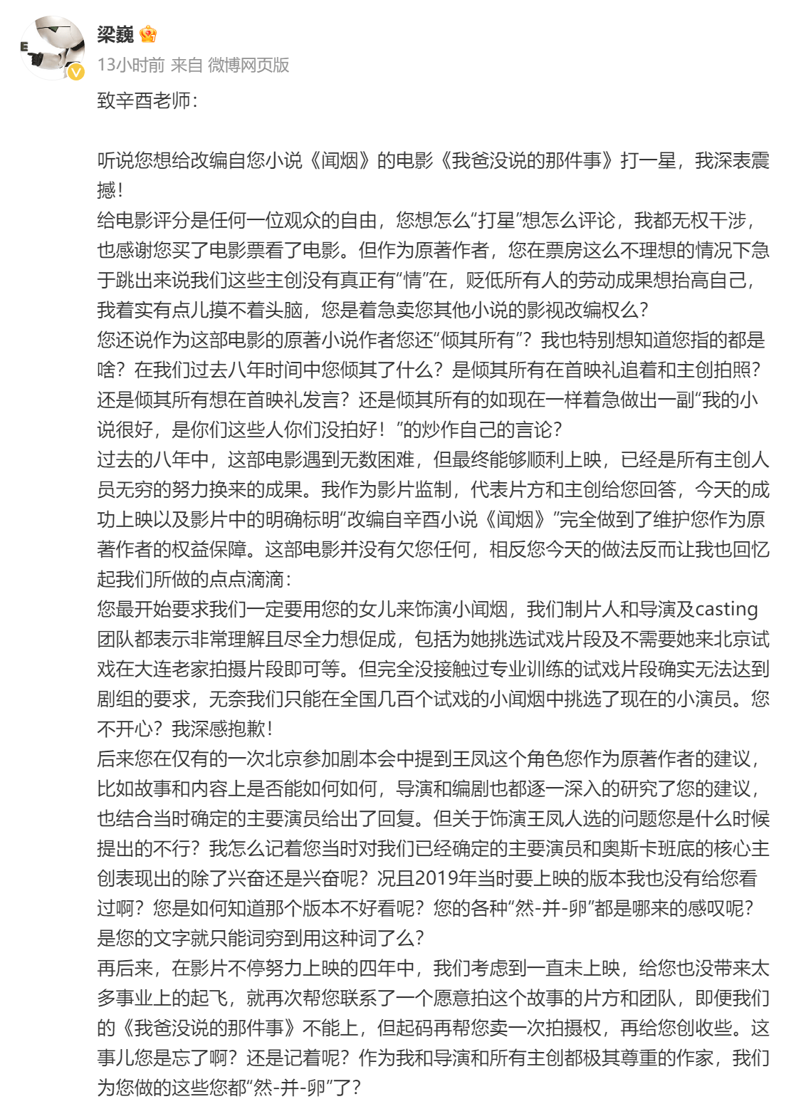 他在文中揭露了辛酉不少过分之举,斥责对方“贬低所有人的劳动成果抬高自己”、想在首映礼发言、此前想安排自己女儿饰演小闻烟,以及片方没同意报销机票酒店让她跟路演,及没能安排她和主演合影等,以至于辛酉恼羞成怒。梁巍用这些证明辛酉的批评和打一星的举动,是基于情绪层面,而不是对电影的客观评价。