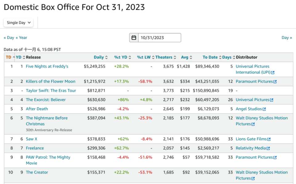 在《玩具熊》的强劲驱动下,北美周末大盘上涨49.9%至逾1.26亿美元,为今年第27次叩开亿元关口。再加上《泰勒·斯威夫特:时代巡回演唱会》的拉抬效应,北美10月总收成最终以5.56亿美元收官,比去年同期提升18.4%;除5月份微跌1.5%之外,今年其他9个月都取得同比成长,且自7月以来的增速均不低于两位数,凸显北美院线的回暖势头未减。