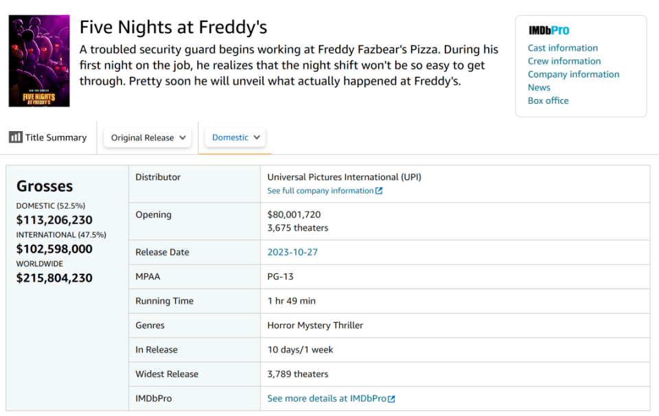 在北美,《玩具熊的五夜惊魂》(以下简称《玩具熊》)飙破8千万美元,闯入影史恐怖片开画榜前三甲,成为驱动淡季市场回暖的引擎;历经多年的开发周期后,Blumhouse终于将这一人气游戏搬上大银幕,延续今年以小博大的高回报率策略,进一步夯实好莱坞恐怖片大厂的地位。