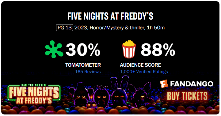 不过,《玩具熊》的口碑呈现激烈分化之势,汇集主流媒体意见的烂番茄新鲜度仅为30%,和《驱魔人:信徒》(22%)处在相近层级;影评人认为遍布片中的彩蛋“对于游戏迷来说可能会很有趣”,但其他观众则会觉得其“混乱且绝对不可怕”。另一方面,《玩具熊》的爆米花指数冲至88%,且CinemaScore也达到A-,足见粉丝对电影版的喜爱。