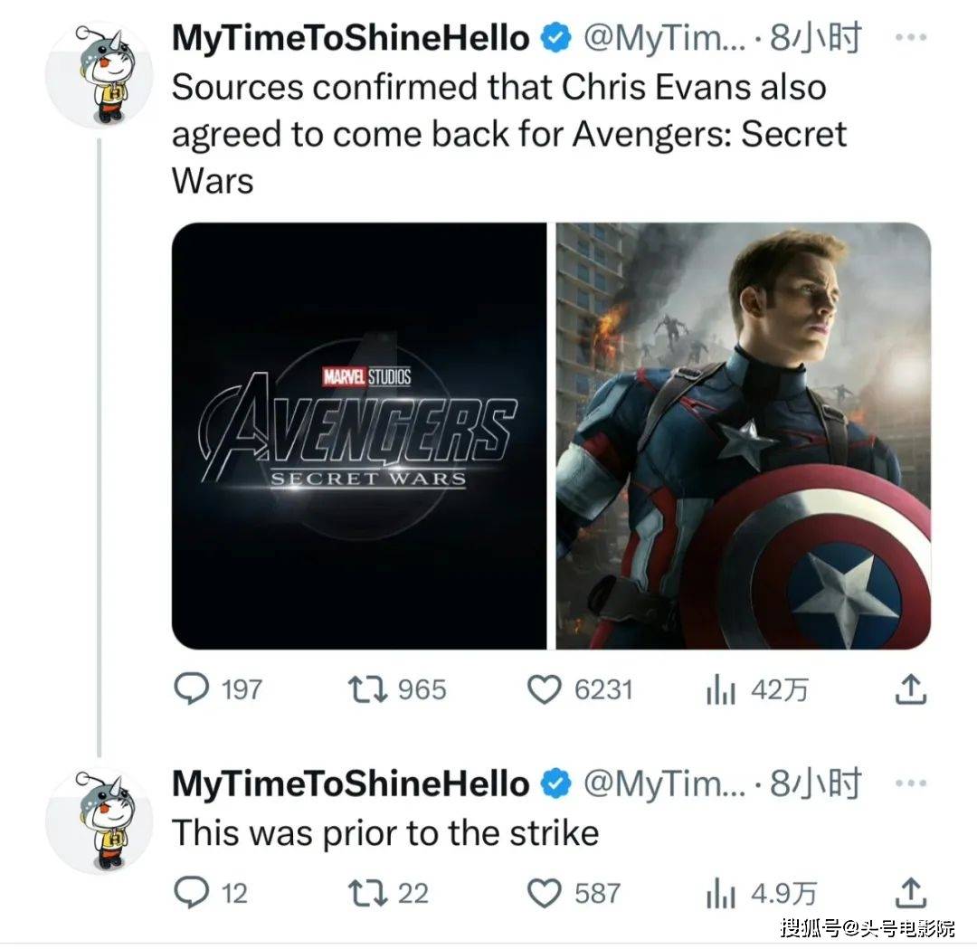 对此,他转发回复的内容是:“秘密战争有,康之王朝无……”(注:《康之王朝》是《复联5》,《秘密战争》是《复联6》)