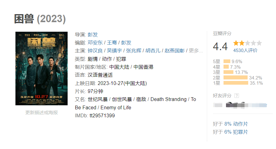四部新片有两部算是文艺片,另外两部是商业片。文艺片不好卖属于常见的市场现象,毕竟小众趣味;商业片卖不动,要不就是宣传不够,要不就是质量不够,而《困兽》明显就是宣传和质量都不太够。