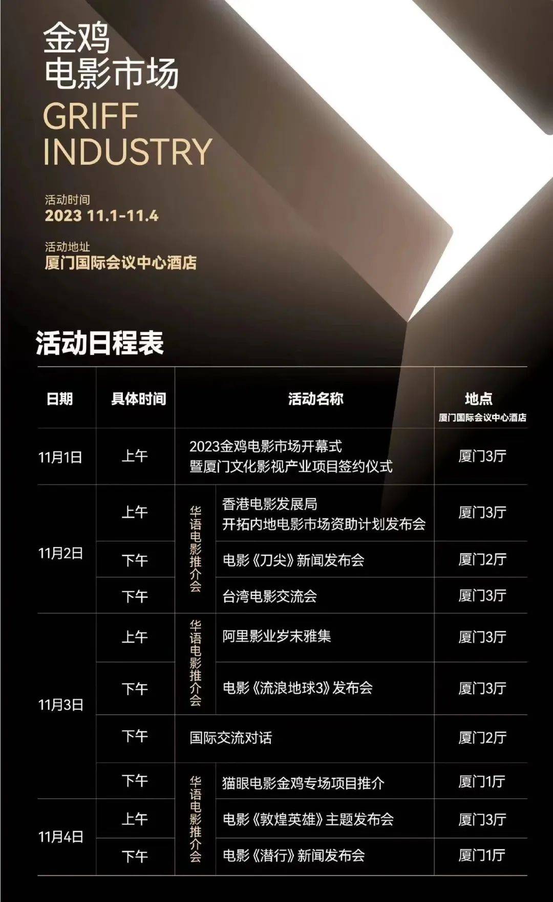 这背后的逻辑很容易理解,院线影片推介会与金鸡电影节时间段相近,市场类活动定位也有所重叠,导致了院线电影推介会不可避免地被影响。
