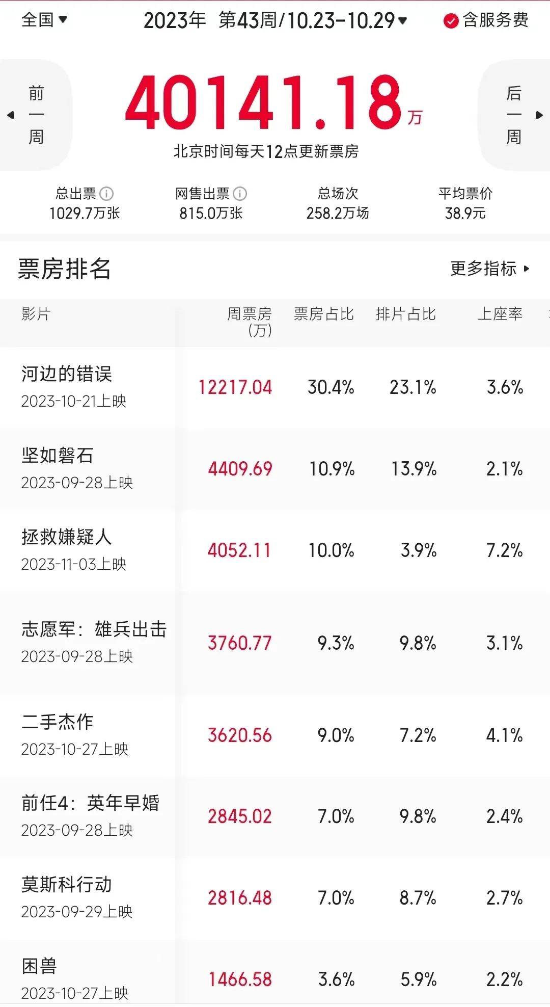 上周末迎来了一波小片海,但总体票房吸引力平淡,但有《拯救嫌疑人》提前点映加持,多少算稳住了局面。据猫眼数据,10.23-10.29一周内地票房报收4.01亿,较前一周的4.39亿小幅下跌8.6%。