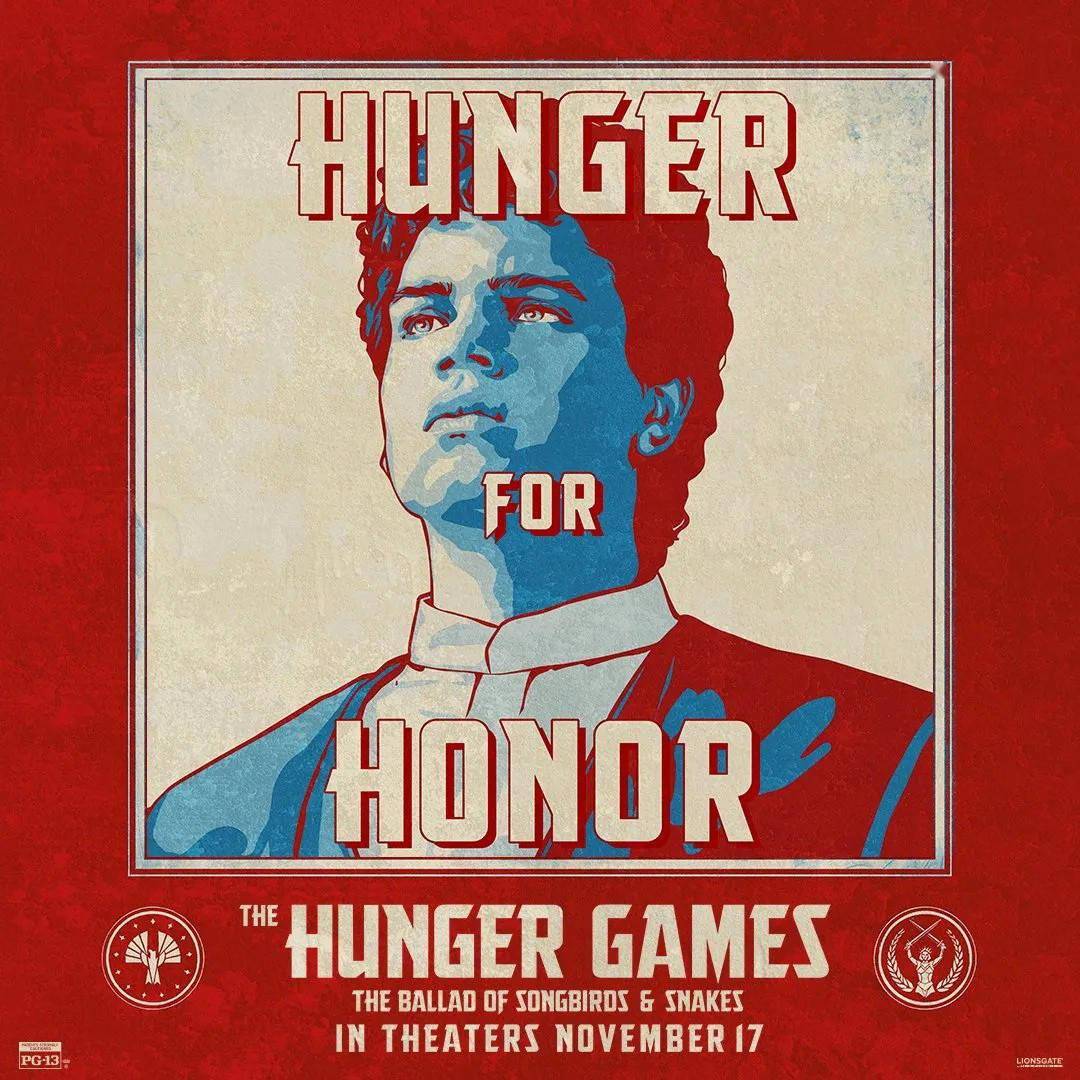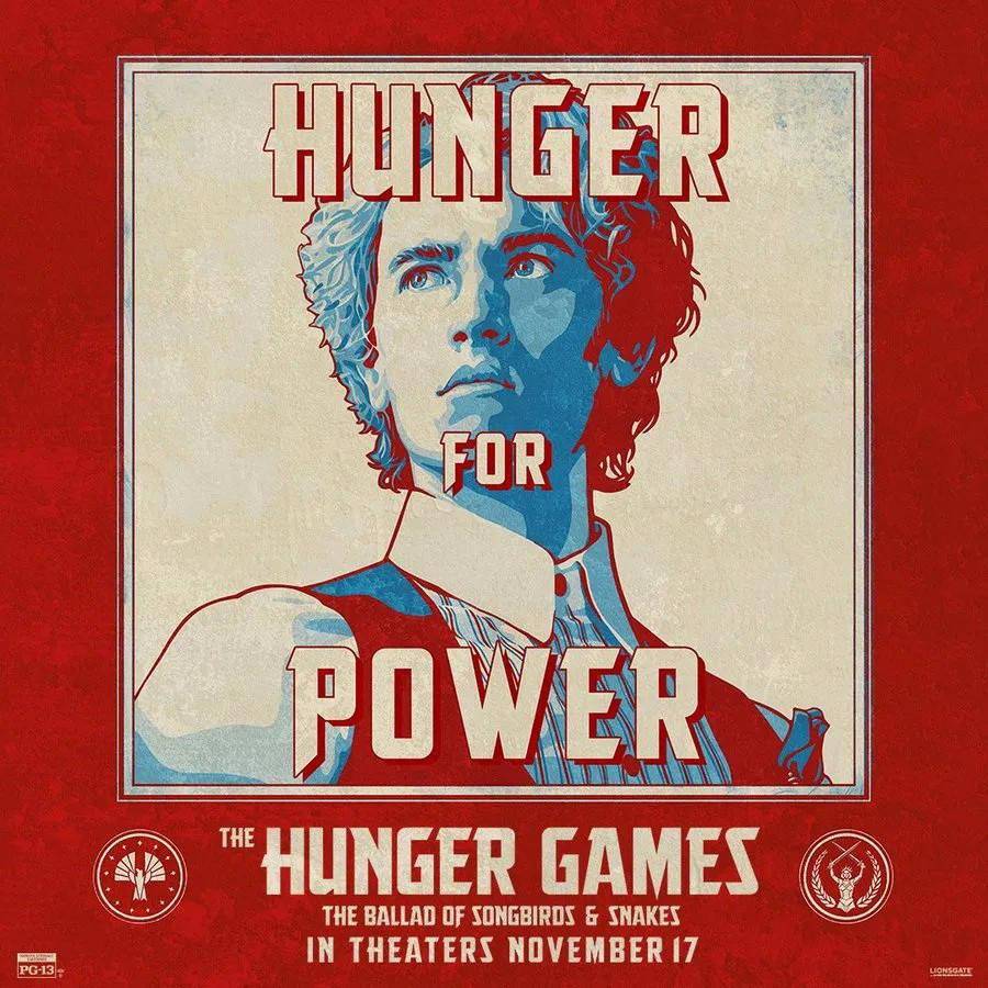 这组海报暗合了影片的故事情节,每个人物都是“饥饿游戏”的宣传者。在海报上写着“渴求自由”、“渴求权力”、“渴求控制”、“渴求改变”、“渴求荣耀”、“渴求真相”、“渴求名气”的字样。影片改编自原作者苏珊·柯林斯的同名新书,设定在科里奥兰纳斯·斯诺成为施惠国暴君总统的数年前,18岁的斯诺英俊迷人,虽然家族衰落处境艰难,他看到一个改变命运的机会:他被选中成为第十届饥饿游戏的导师。斯诺被派去指导来自贫困第12地区的女孩露西·格雷·贝尔德,后者在收割仪式上挑衅地唱歌,引起所有人的注意。《饥饿游戏》系列导演回归执导前传,最新版剧本由编写,参与创作。