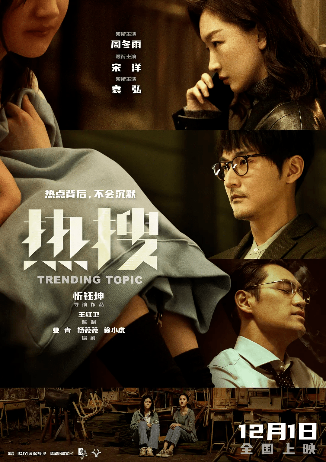 最后一部推荐影片,是定档12月1日的《热搜》,由忻钰坤执导,周冬雨、宋洋、袁弘、王皓领衔主演,讲述了自媒体主编陈妙,发布一篇爆款文章后,意外收到了当事人的求助,并牵扯出一系列意想不到的事件。
