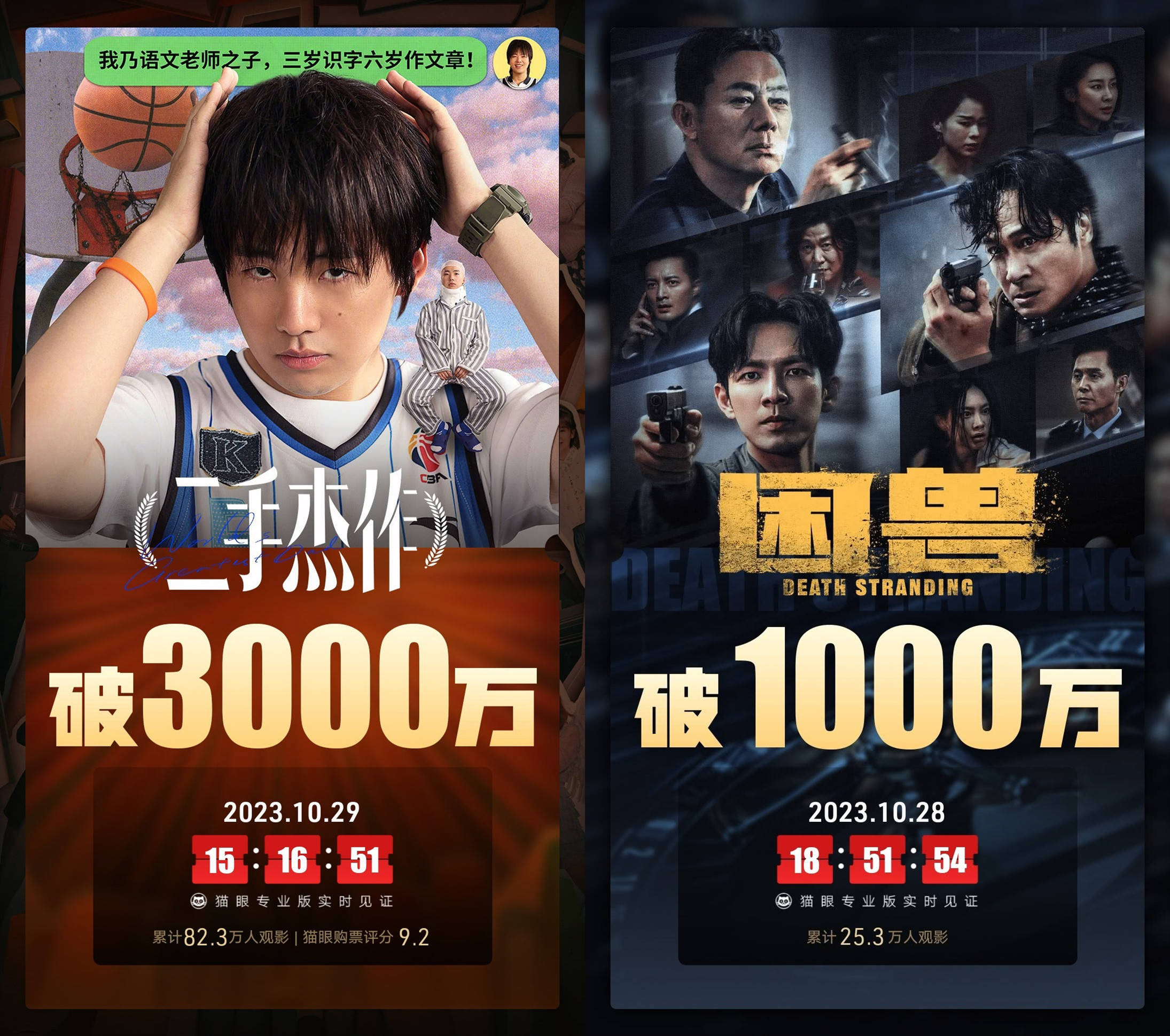 于和伟、郭麒麟、倪虹洁主演的讽刺喜剧电影《二手杰作》首周三天揽3685.77万位列第五;钟汉良、吴镇宇主演犯罪动作电影《困兽》仅收1472.29万排第八。