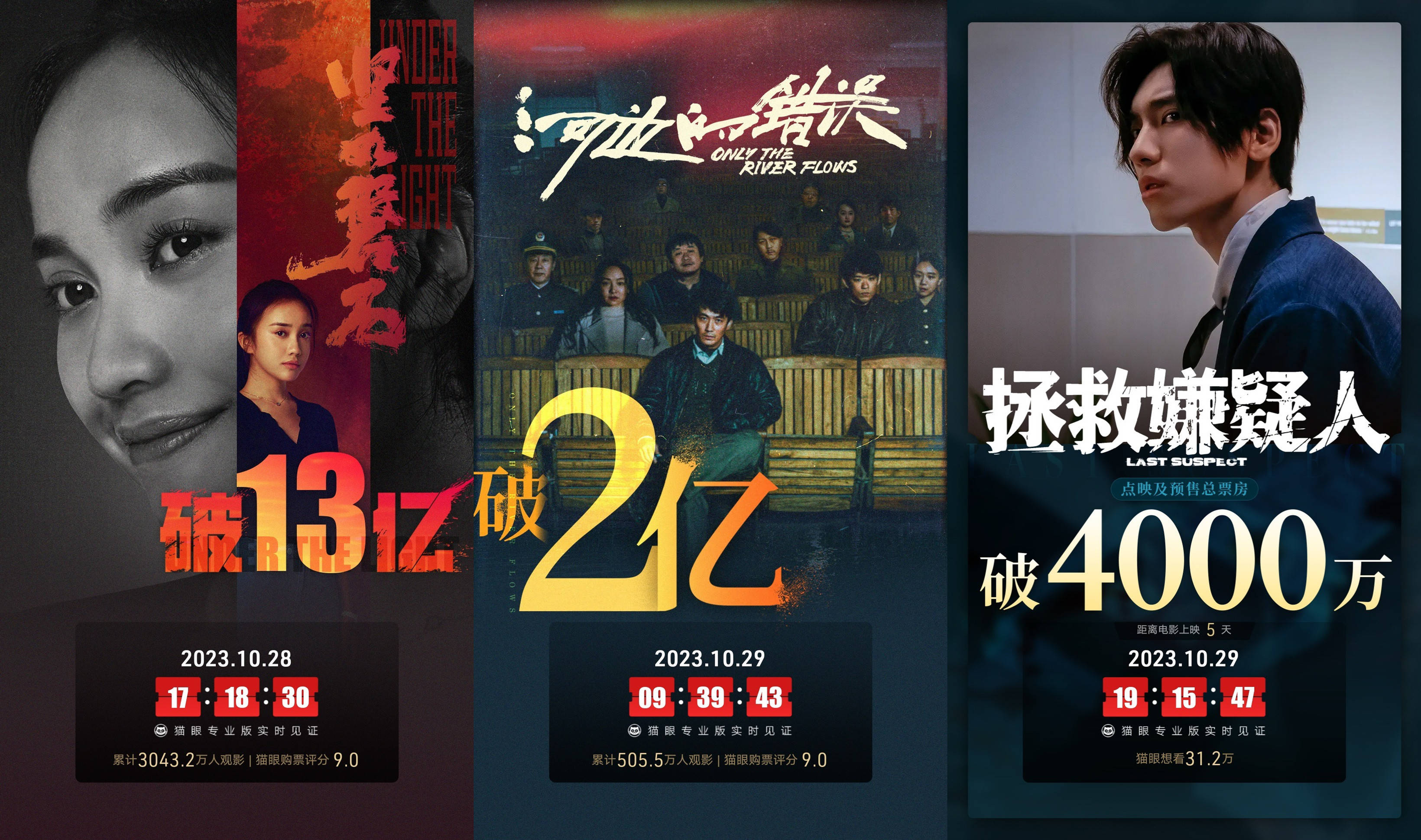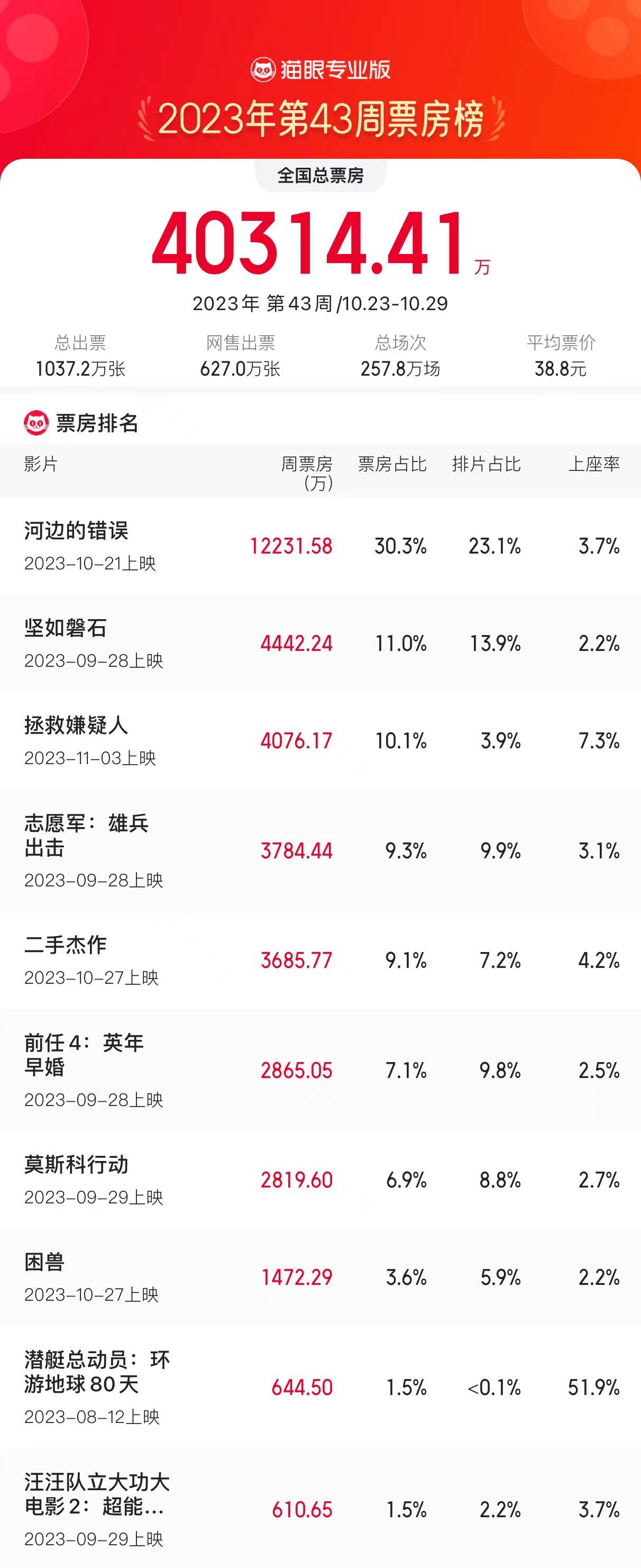 原标题:10.23-10.29内地周票房报收4.03亿 朱一龙《河边的错误》1.22亿夺冠累计破2亿