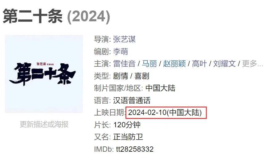 他虽然没有具体说电影名字,但根据他之前的拍摄工作,可以推断出是《第二十条》,平台也标记电影将在2024年2月10日上映。