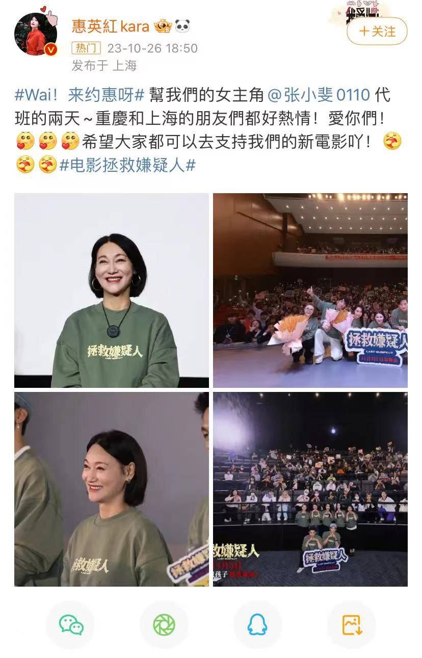 特邀演员惠英红发微博表示已经开始路演,参加重庆和上海的路演,说是帮张小斐代班,张小斐IP地址显示在四川,不知道是不是在拍戏?主演没有参加路演这说不过去,惠英红还是很有号召力,她演技很棒,已经凭借《我爱你!》入围金鸡奖最佳女主角,获奖的几率很大。
