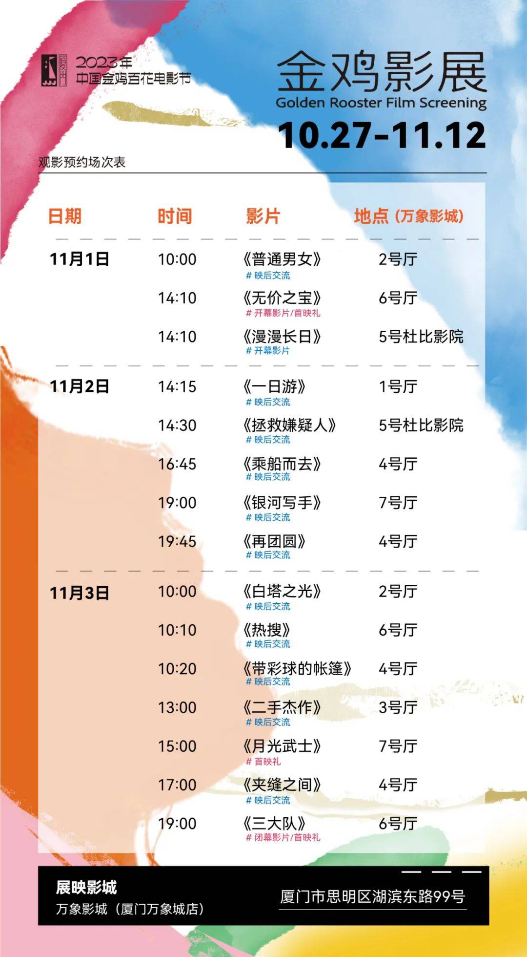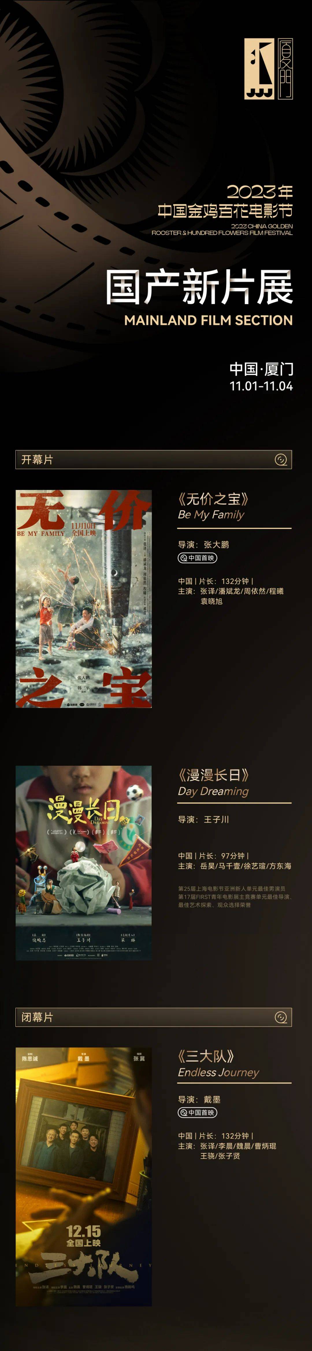 2023年中国金鸡百花电影节即将于11月初在厦门举行,作为金鸡影展的重要组成单元,金鸡国产新片展拟于 11 月 1 日至 3 日在厦门万象影城举行,共有15部热门佳片将参加影片展映、映后互动、沙龙对谈、荣誉推介等活动。