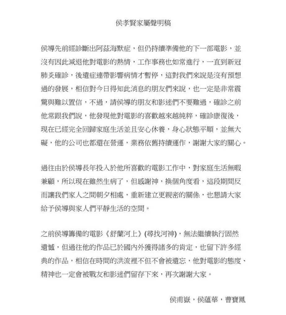10月25日,侯孝贤家人发布声明,向外界公布他的近况。家属证实其罹患阿尔兹海默症,并透露侯导早前获悉自己患病后,仍在准备下一部电影,一直到确诊新冠肺炎,后遗症连带影响病情才暂停工作。