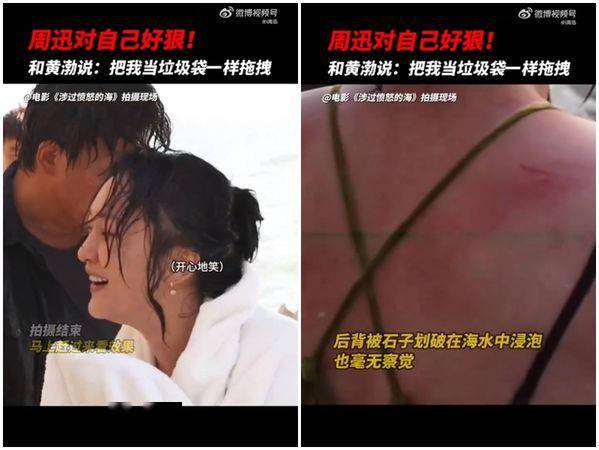 改戏后,黄渤直接拉着周迅的手臂,像拽沙袋一样粗鲁地把人拖上岸。然而,碎石滩上的尖锐石子,将周迅的背部划出好几条血痕,原本白皙的肌肤也磨到发红,但她完全没有抱怨,而是对改戏后的呈现的拍摄效果感到开心。