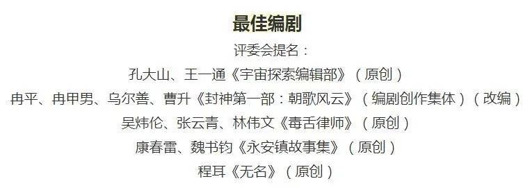 7、最佳编剧提名:孔大山、王一通《宇宙探索编辑部》;冉平、冉甲男、乌尔善、曹升《封神第一部:朝歌风云》;吴炜伦、张云青、林伟文《毒舌律师》;康春雷、魏书钧《永安镇故事集》;程耳《无名》