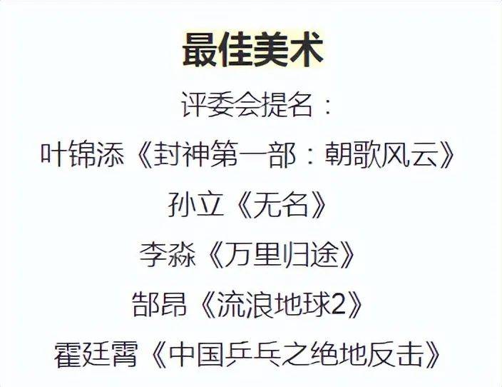 《流浪地球2》只获得最佳影片、最佳录音和最佳美术3项提名;《满江红》更惨,只有最佳男配角和最佳音乐2项提名。