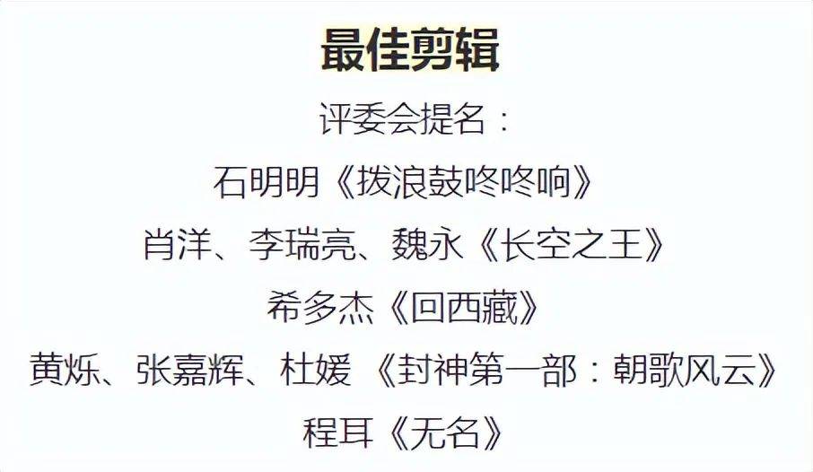 11、最佳剪辑提名:石明明《拨浪鼓咚咚响》;肖洋、李瑞亮、魏永《长空之王》;希多杰《回西藏》;黄烁、张嘉辉、杜媛 《封神第一部:朝歌风云》;程耳《无名》