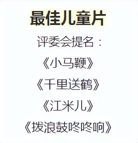 3、最佳儿童片提名:《小马鞭》、《千里送鹤》、《江米儿》、《拨浪鼓咚咚响》