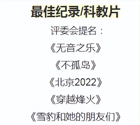 5、最佳纪录/科教片提名:《无音之乐》、《不孤岛》、《北京2022》、《穿越烽火》、《雪豹和她的朋友们》