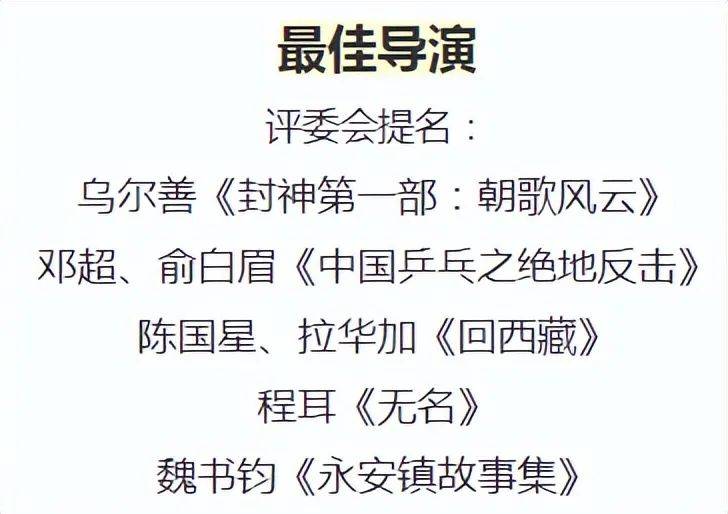 2、最佳导演提名:乌尔善《封神第一部:朝歌风云》;邓超、俞白眉《中国乒乓之绝地反击》;陈国星、拉华加《回西藏》;程耳《无名》;魏书钧《永安镇故事集》