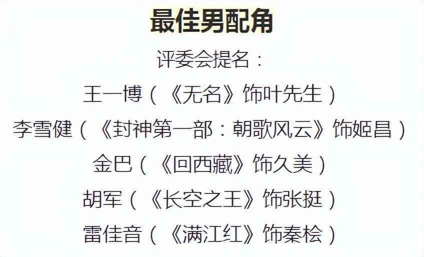 5、最佳男配角提名:王一博(《无名》饰叶先生)、李雪健(《封神第一部:朝歌风云》饰姬昌)、金巴(《回西藏》饰久美)、胡军(《长空之王》饰张挺)、雷佳音(《满江红》饰秦桧)