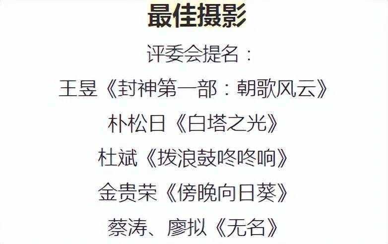 7、最佳摄影提名:王昱《封神第一部:朝歌风云》;朴松日《白塔之光》;杜斌《拨浪鼓咚咚响》;金贵荣《傍晚向日葵》;蔡涛、廖拟《无名》