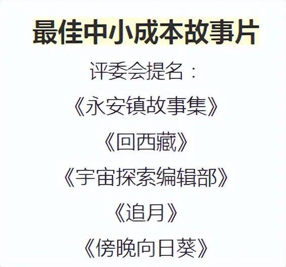 2、最佳中小成本故事片提名:《永安镇故事集》、《回西藏》、《宇宙探索编辑部》、《追月》、《傍晚向日葵》