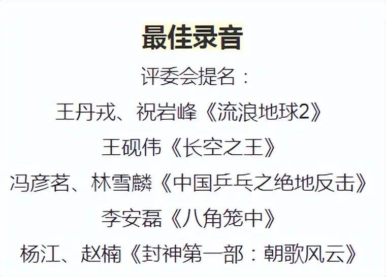 8、最佳录音提名:王丹戎、祝岩峰《流浪地球2》;王砚伟《长空之王》;冯彦茗、林雪麟《中国乒乓之绝地反击》;李安磊《八角笼中》;杨江、赵楠《封神第一部:朝歌风云》