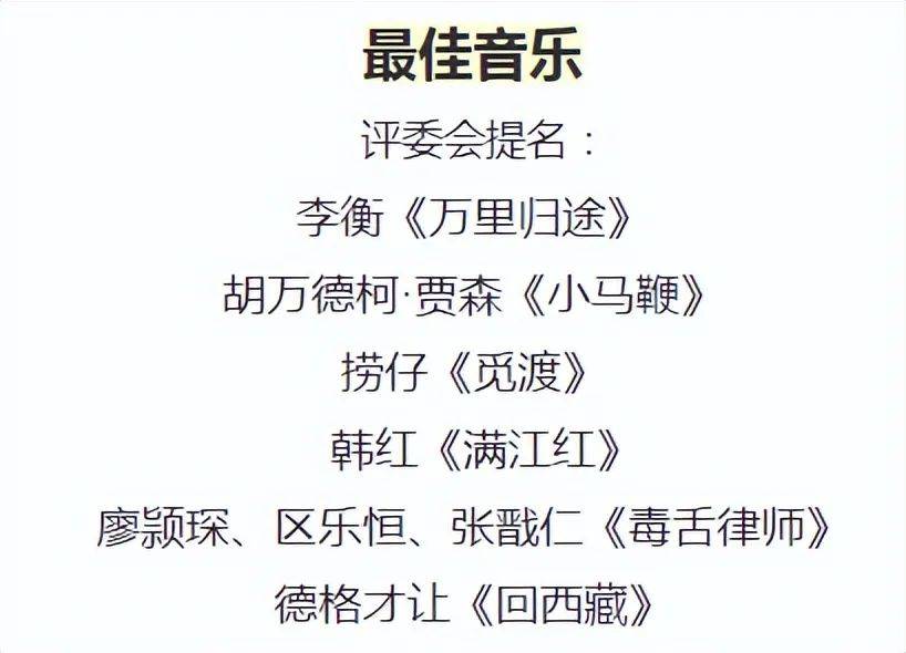 10、最佳音乐提名:李衡《万里归途》;胡万德柯·贾森《小马鞭》;捞仔《觅渡》;韩红《满江红》;廖颕琛、区乐恒、张戬仁《毒舌律师》;德格才让《回西藏》